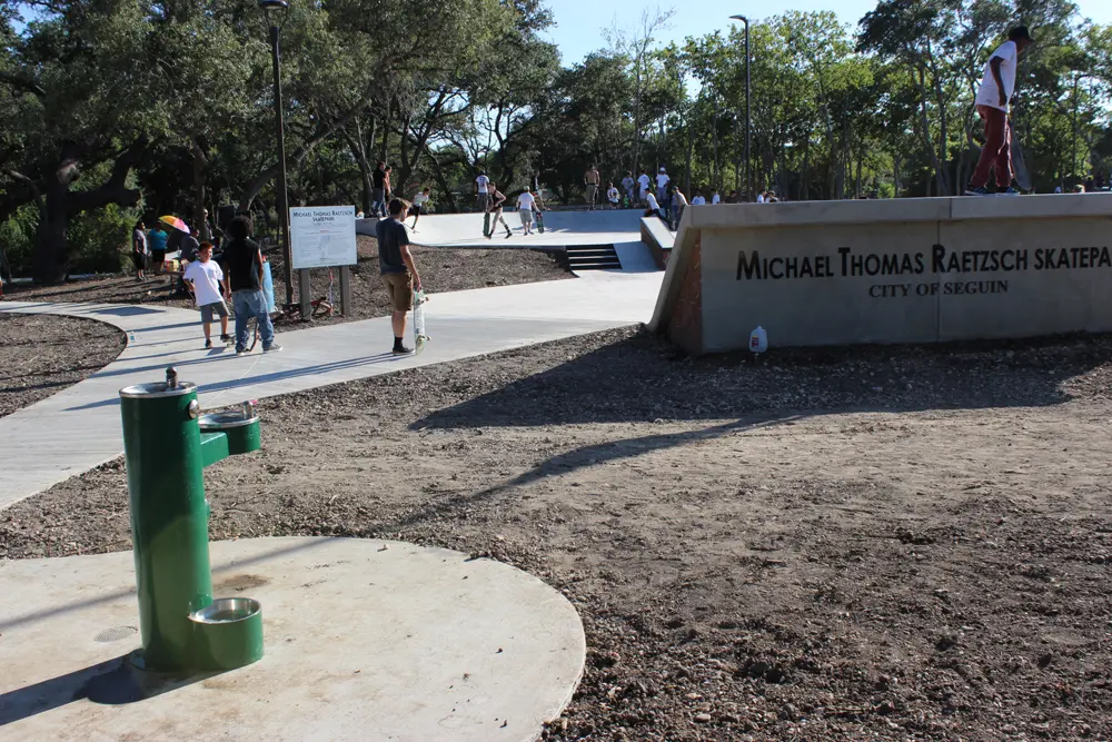 The skatepark and surrounding areas come fully loaded with other park amenities as well. The City installed LED skatepark lighting system! This will allow skateboarders to use the park in the evenings during the hot summer months, and in the winter when the days get dark soon after school ends. There is a parking lot that will be shared with the basketball court and a skater and dog friendly water fountain. Irrigation and grass installation are planned for the coming months. The Texas Department of Transportation (TXDoT) also worked in the area, installing a concrete pedestrian pathway that connects the west side of Seguin to downtown.